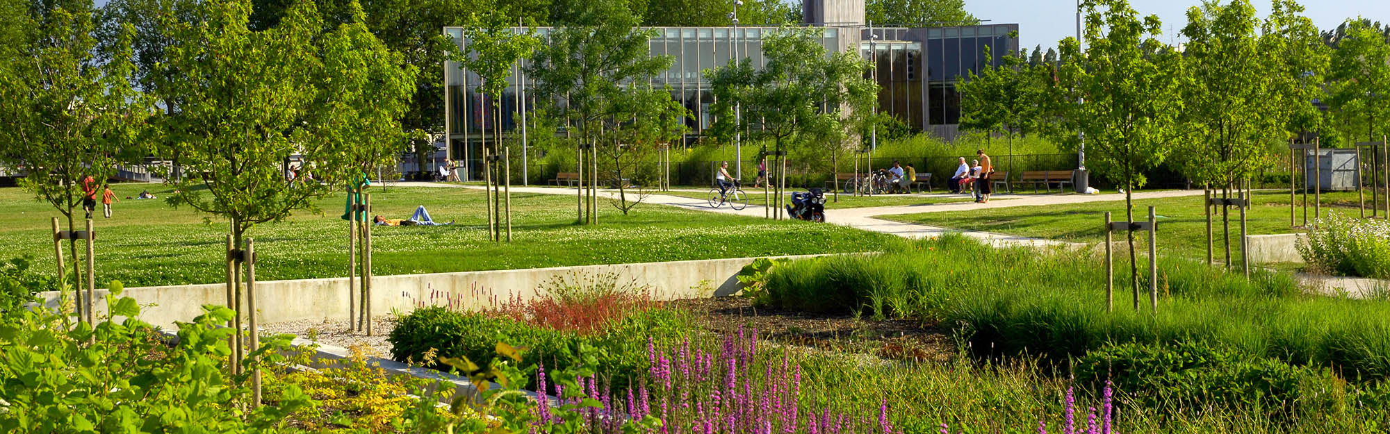 Ils sont ouverts toute l’année. Il existe deux jardins : le jardin mosaïque, qui sert d’accès à la plaine et dont la conception évoque les photos aériennes de Yann Arthus Bertrand et le jardin humide, destiné à exploiter la proximité de l’eau, qui trouve sa source dans la culture asiatique (bassins, nénuphars, bambous).